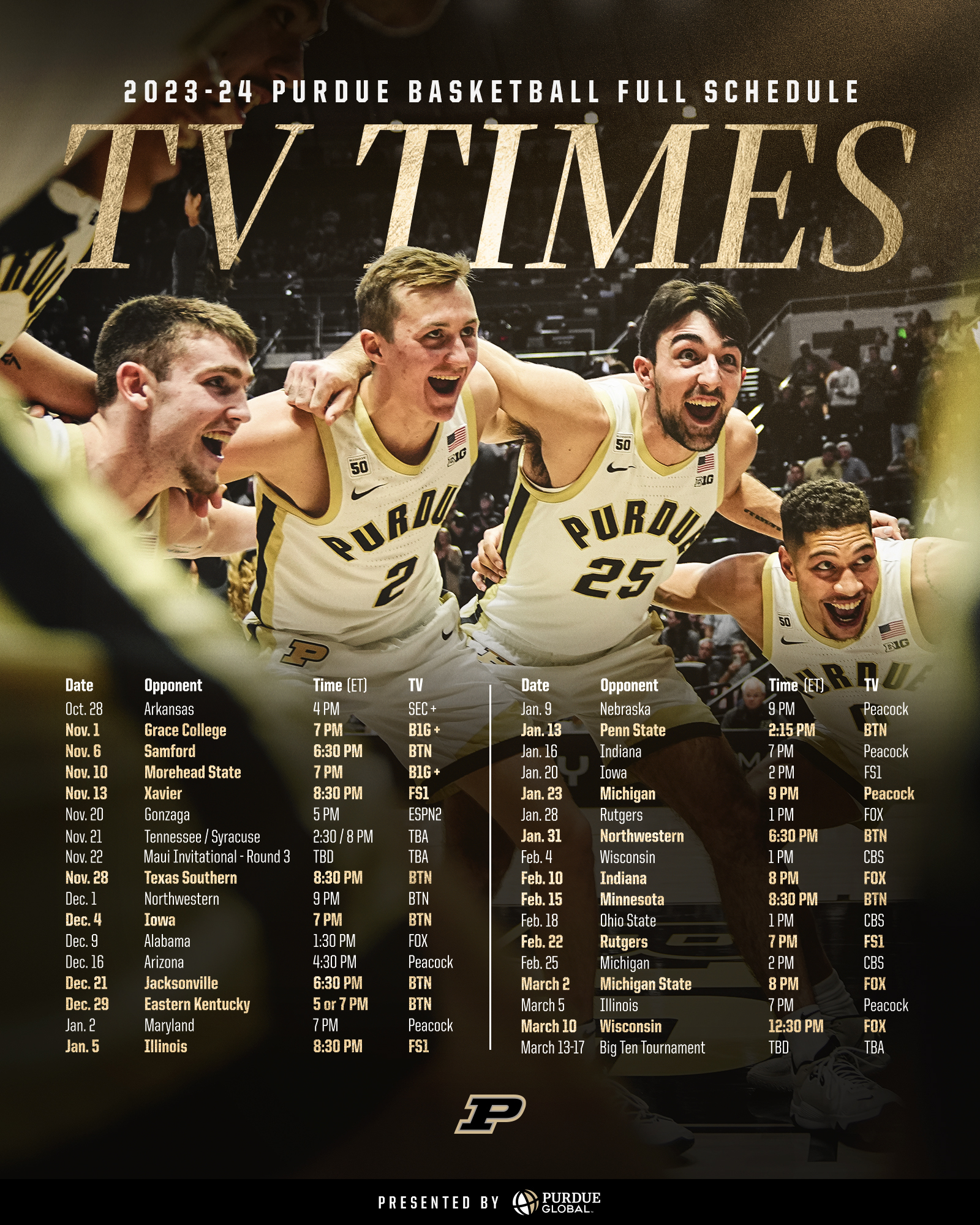 The official 2023-24 Mens Basketball schedule for the Purdue University Boilermakers. 34 rows 18-2 2nd in Big Ten ESPN has the full 2023-24 Purdue Boilermakers Regular Season NCAAM schedule. The Big Ten Conference announced its 2023-24 composite schedule. The 2023-24 Purdue mens basketball season is presented by Purdue Global Purdue Universitys online. . . The Purdue Boilermakers will open their 20-game Big Ten slate with a Dec..
